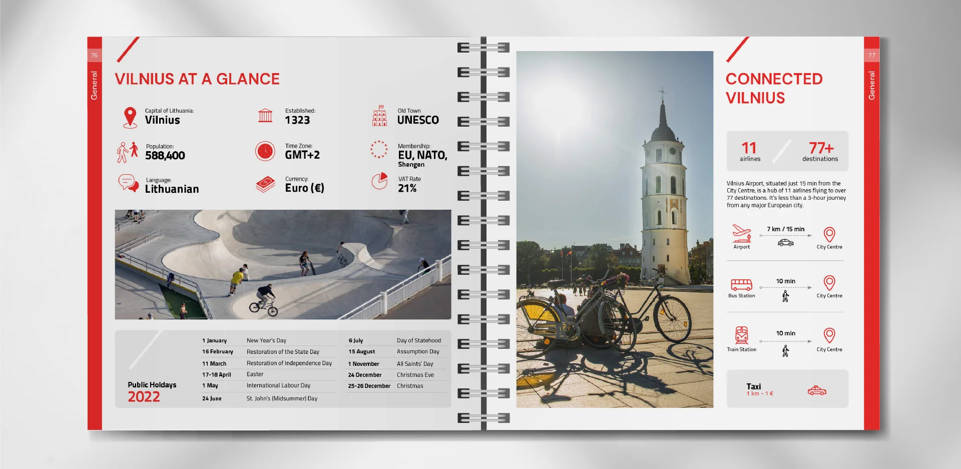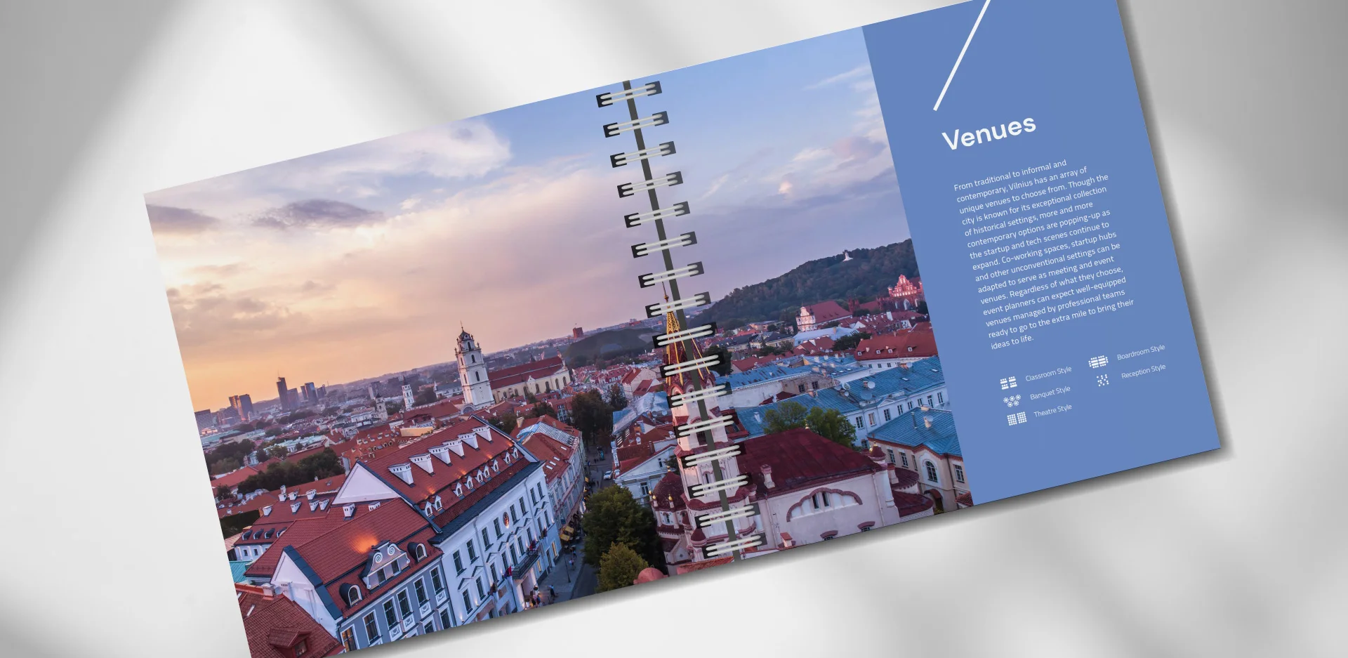 Leidinyje pateikiama informacija apie Vilniaus viešbučius, konferencijų centrus, muziejus, teatrus, mokslo įstaigas, bendradarbystės erdves ir kitas renginiams tinkamas vietas. Organizatorių patogumui viskas pateikta su detalia technine informacija – salių plotais, vietų skaičiumi, maitinimo ir apgyvendinimo galimybėmis. Kurdami leidinio dizainą, pasirinkome minimalistinį viršelį, kurio pavadinime slepiasi nuotrauka iš Vilniaus šviesų festivalio. Leidinys padalintas į keturias spalvomis atskirtas dalis, kad informacija būtų lengviau randama. Ikonų sistema padėjo struktūruoti duomenis, o elektroninę versiją papildėme 3D turais.