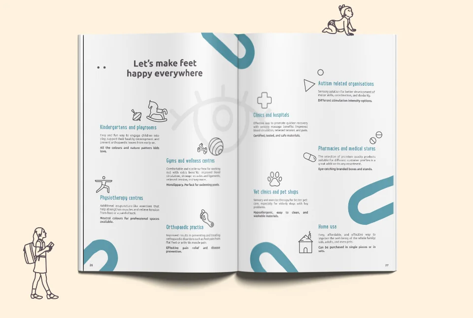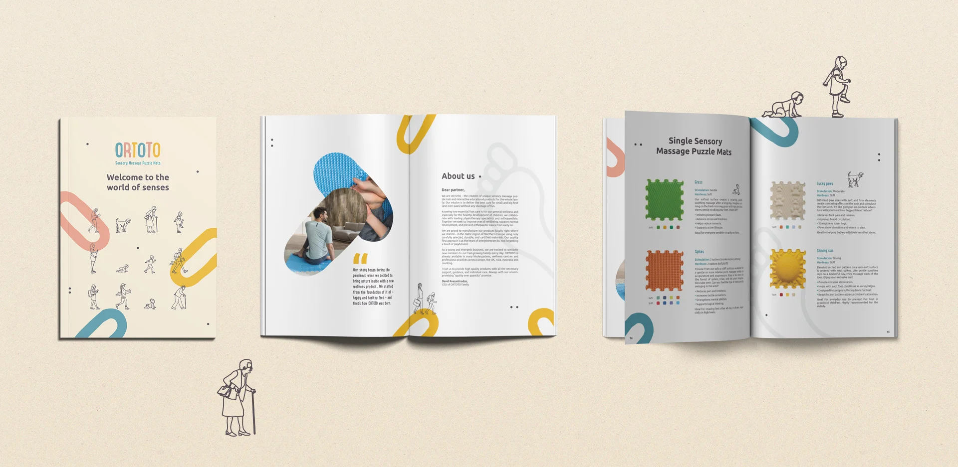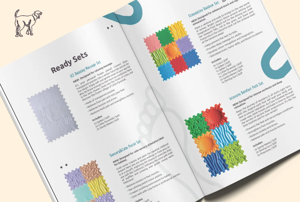 Kurdami masažinių kilimėlių katalogą – nuo koncepcijos ir struktūros iki dizaino ir tekstų – siekėme perteikti prekės ženklo toną: draugišką, artimą ir žaismingą. Leidinio grafikos simboliu tapo O raidė iš logotipo – ji naudojama tiek grafikoje, tiek nuotraukų formoms paįvairinti. Viršelį iliustruoja auditoriją atspindinčios ikonos, o kaip antrinę grafiką pasirinkome pojūčių motyvus – regėjimą ir lytėjimą. Maži taškučiai primena kilimėlių dygliukus, o ikonos nuo viršelio tematiškai kartojasi ir vidiniuose puslapiuose.