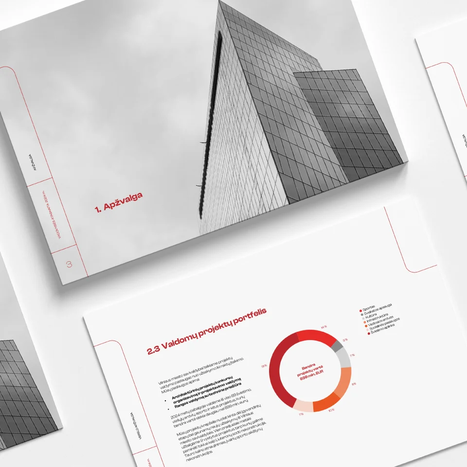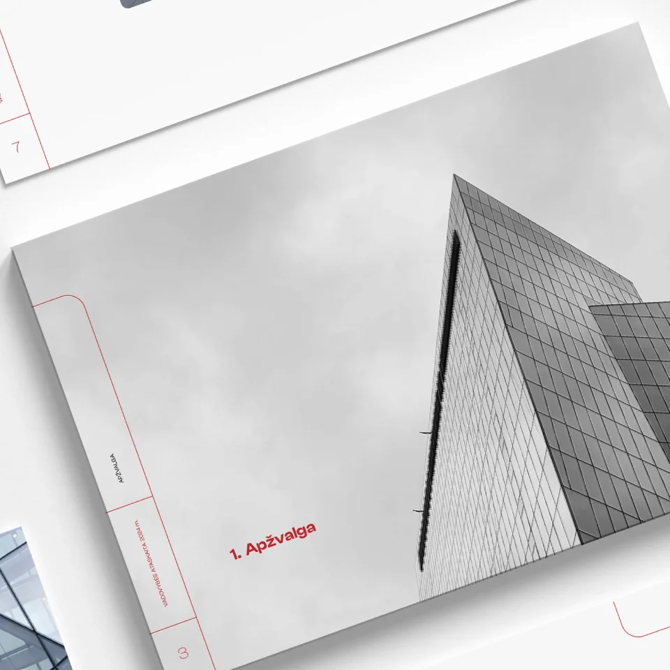 Vadovybės ataskaitoje dominuoja linijinė grafika, juntamas lengvumo, švarumo ir gaivumo pojūtis – kai informacijos daug, neapsunkinti puslapių dizaino yra tiesiog privaloma. Vizualui pagyvinti įvestas grafinio elemento – užapvalinto kvadrato – fragmentas. Elemento vieta nėra pastovi, derinama su tuščia erdve, kinta puslapiuose, taip įnešant šiek tiek dinamikos, bet neužgožiant dėmesio nuotraukoms ar tekstinei informacijai. Švarumo įspūdžio sustiprinimui ir vizualinio identiteto atliepimui naudojame raudoną spalvą, papildytą juoda ir švelniai pilka spalvomis.