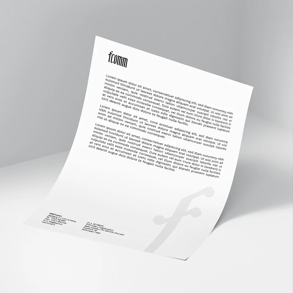 Fcomm – finansinių komunikacijų agentūra, išsiskirianti precizika, nuoseklumu ir aiškumu. Šias vertybes atspindi ir logotipas – modernus gotikinio šrifto variantas, kuriame itin aukštos, pailgos raidės simbolizuoja stabilumą ir tikslumą. Nors formos griežtos, apvalinti kampai suteikia subtilaus švelnumo ir modernumo. Rezultatas – minimalistinis, išraiškingas ženklas, perteikiantis agentūros profesionalumą ir pasitikėjimą.