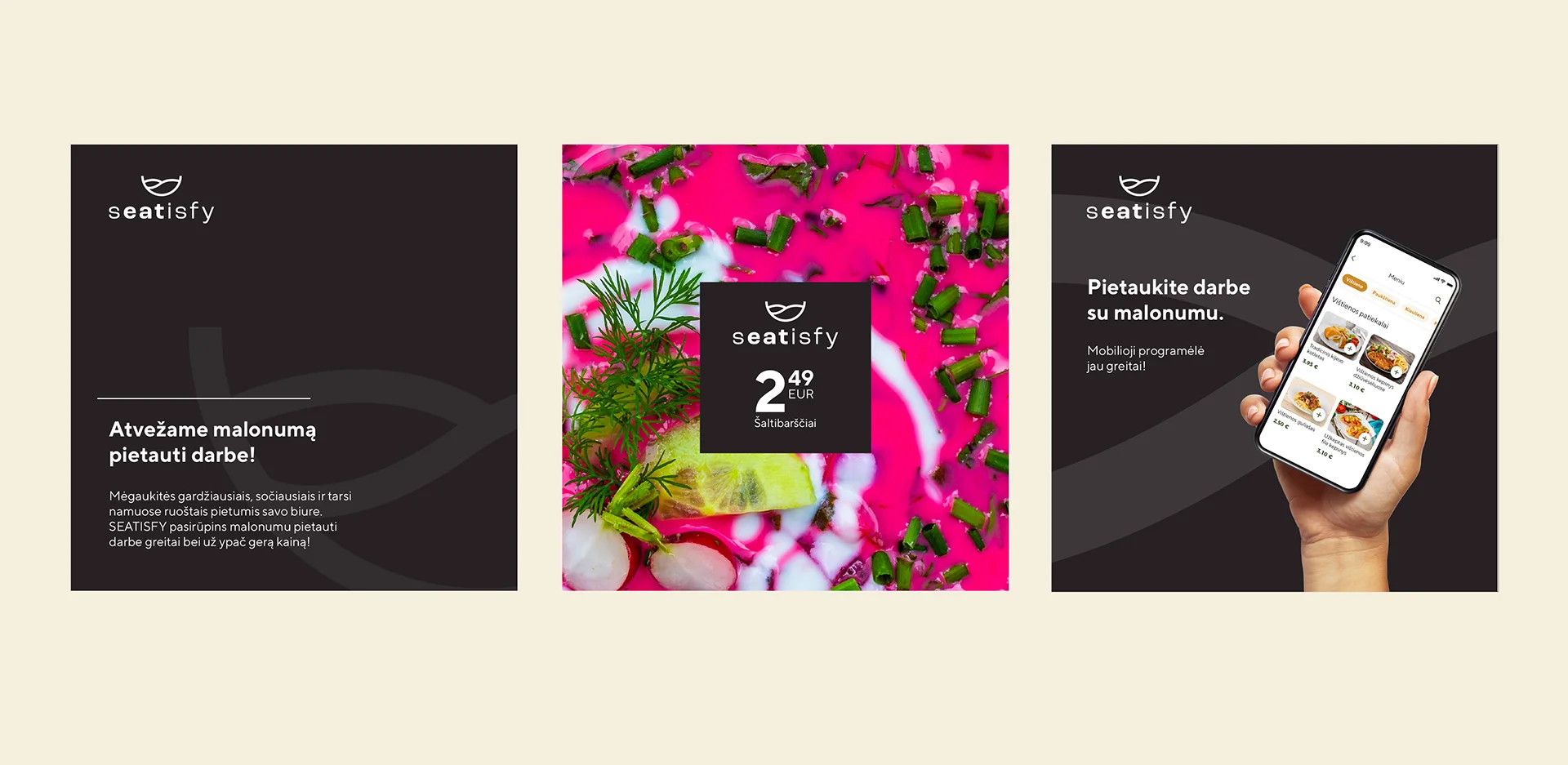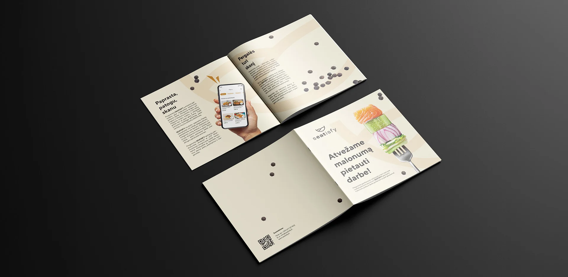 Jogundė – ilgametė maitinimo paslaugų įmonė Vakarų Lietuvoje, ieškanti naujų verslo galimybių. Brangstant maistui mieste ir trūkstant vietų pietums, ji ėmėsi spręsti įmonių darbuotojų maitinimo klausimus ir kurti maisto užsakymo į darbą platformą. Mūsų užduotis – sukurti šiai platformai pavadinimą, logotipą ir vizualinį stilių. Taip gimė Seatisfy – šiuolaikiškas, daugiaprasmis pavadinimas, jungiantis „sea“, „eat“ ir „satisfy“. Logotipe šis žaismingas junginys dar labiau išryškintas, akcentuojant EAT, kad netyčia nepasimestų jūroje. Simboliui pasirinkome dubens formą – aiškų maisto srities ženklą, kurio minkštos, dinamiškos linijos primena ir maistą, ir jūrą. Dubuo tapo viso vizualinio identiteto pagrindu.