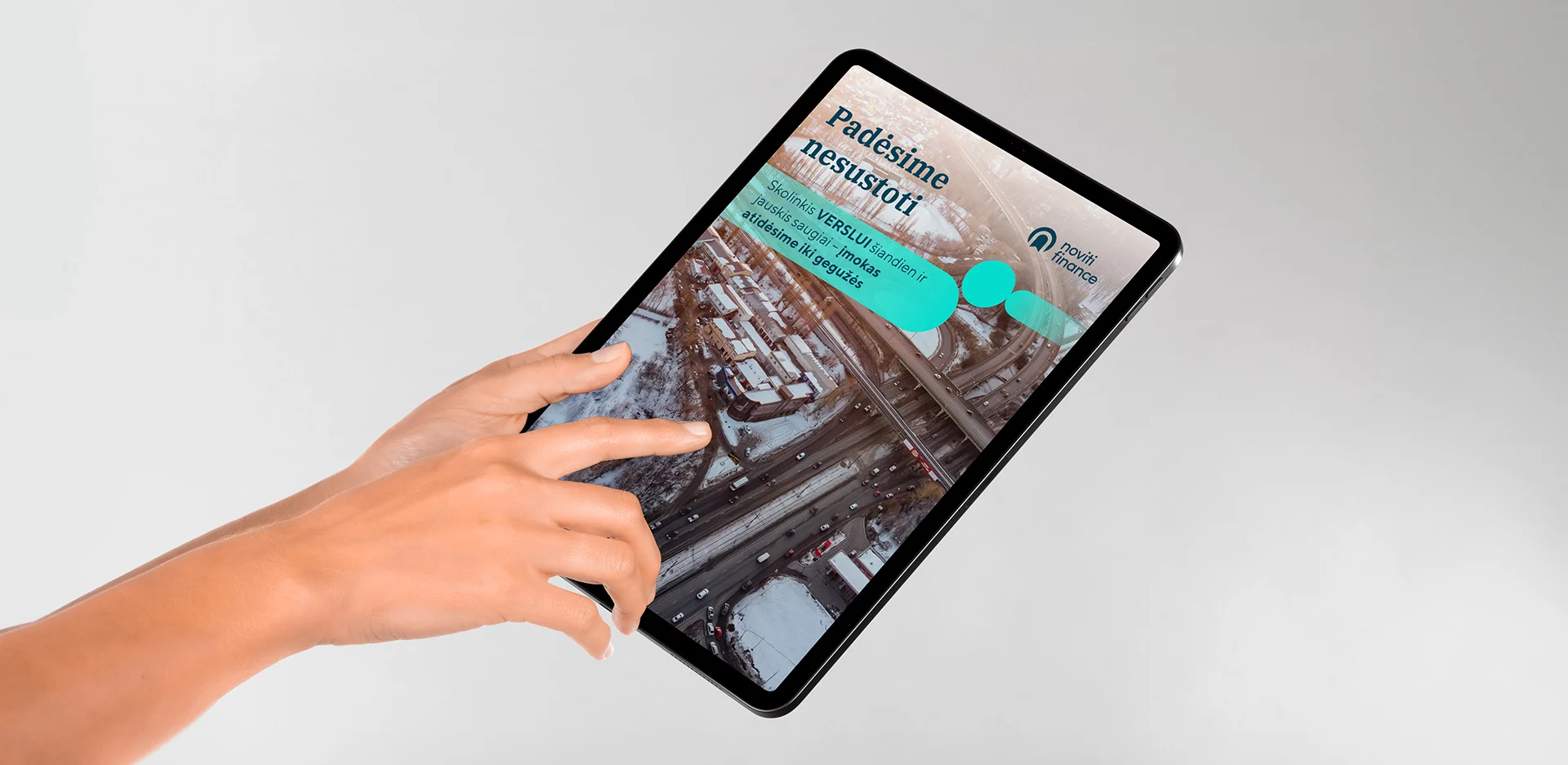 Noviti Finance – paskolas verslui teikianti įmonė, šįkart siekusi paskatinti smulkiuosius verslus toliau augti, pasinaudojant itin palankiomis skolinimosi sąlygomis. Mūsų užduotis – sukurti koncepciją, žinutes, dizaino sprendimus ir įgyvendinti reklaminę kampaniją. Parengėme dvi tematiškai susijusias koncepcijas – abi apie verslo vystymąsi, judėjimą ir pagalbą augimui. Vienoje pasitelkėme žalios šviesos, kaip įgalinimo veikti, idėją, kitoje – nenutrūkstančio kelio motyvą, kuriame nėra šviesoforų, galinčių sustabdyti eismą. Kampanijos žinutė aiški – „Padėsime nesustoti.“